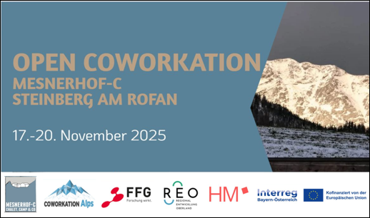Die Open Coworkation Woche findet zwischen dem 17. und 20. Nov 2025 statt. Zwischen konzentriertem Arbeiten in alpiner Umgebung, spannenden Workshops, Netzwerken mit unserer Community und unserer jährlichen Mitgliederversammlung ist immer wieder Zeit, diesen besonderen Ort und die Natur herum zu genießen.
